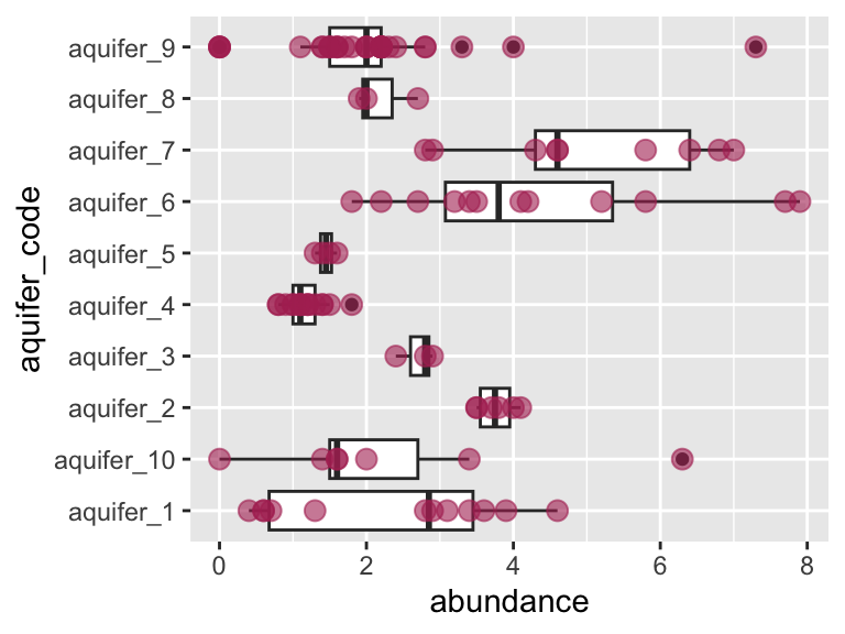 ## # ℹ 1 more variable: abundance <dbl>To work with two means, let’s just look at aquifers 1 and 6: