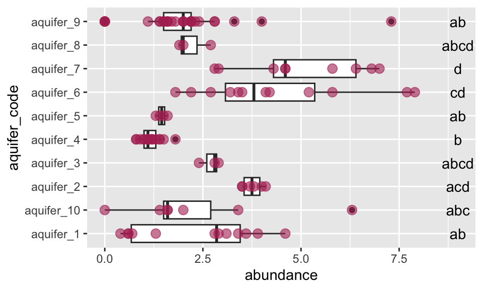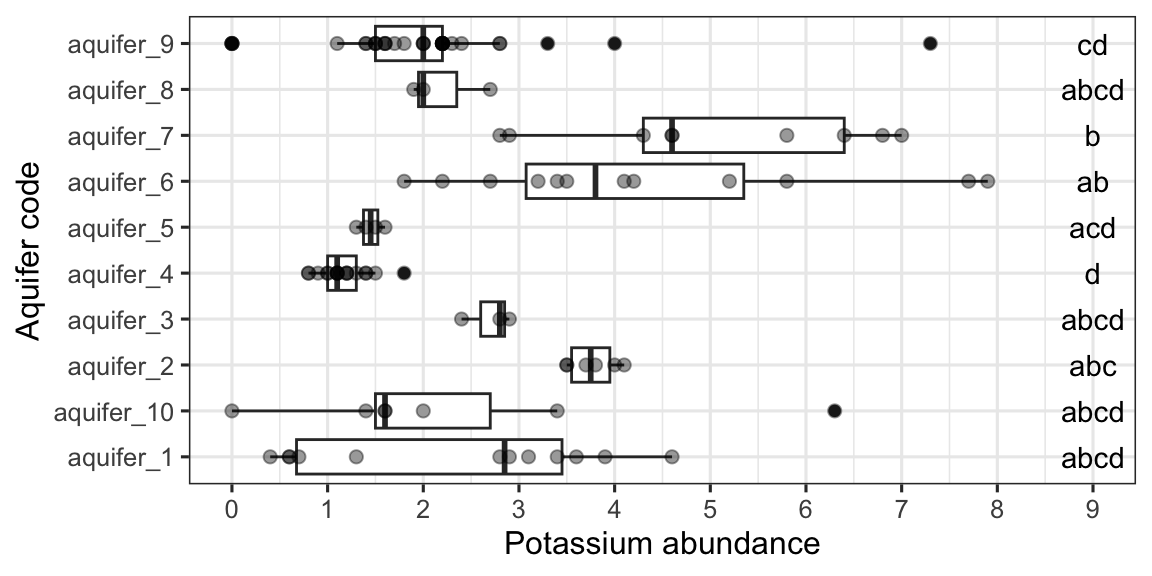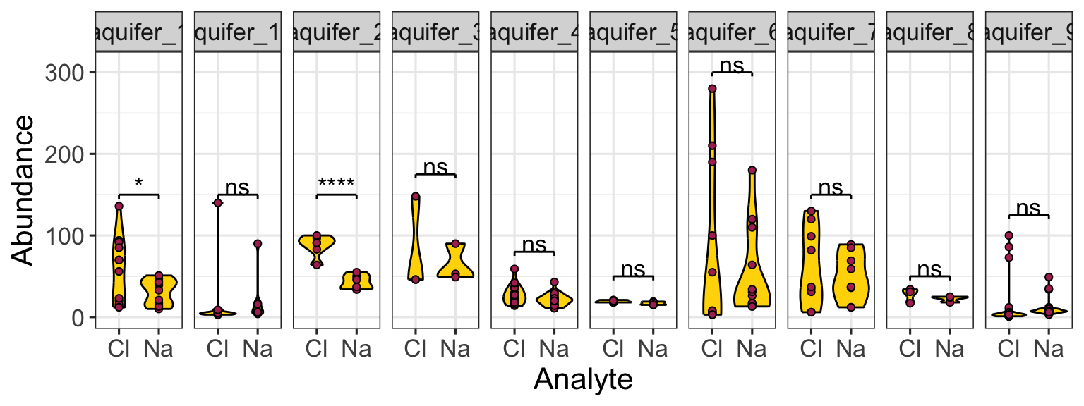 ## # p.adj.signif <chr>Excellent! It looks like there is a statistically significant difference between the means of the abundances of Cl and Na in aquifer_2 and (surprisingly?) in aquifer_9 (perhaps due to the large number of observations?).