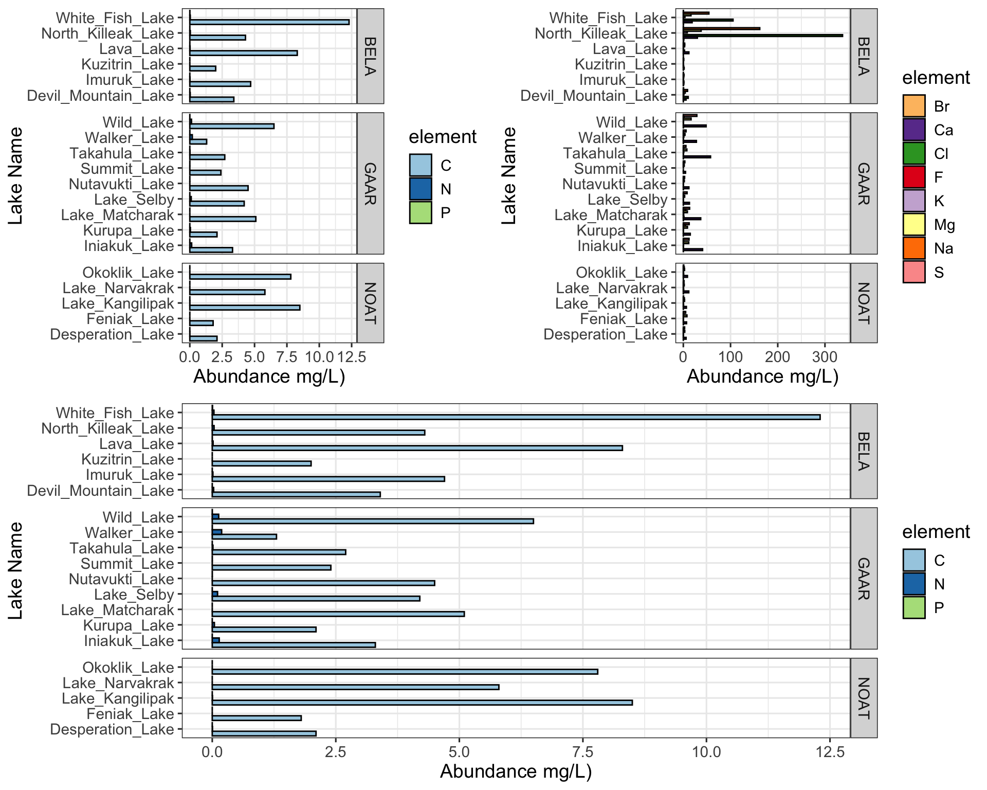 Figure 4.1: Figure 1: Carbon, nitrogen, and phosphorous in Alaskan lakes. A) A bar chart showing the abundance (in mg per L, x-axis) of the bound elements (C, N, and P) in various Alaskan lakes (lake names on y-axis) that are located in one of three parks in Alaska (park names on right y groupings). B) A bar chart showing the abundance (in mg per L, x-axis) of the free elements (Cl, S, F, Br, Na, K, Ca, and Mg) in various Alaskan lakes (lake names on y-axis) that are located in one of three parks in Alaska (park names on right y groupings). The data are from a public chemistry data repository. Each bar represents the result of a single measurement of a single analyte, the identity of which is coded using color as shown in the color legend. Abbreviations: BELA - Bering Land Bridge National Preserve, GAAR - Gates Of The Arctic National Park & Preserve, NOAT - Noatak National Preserve.