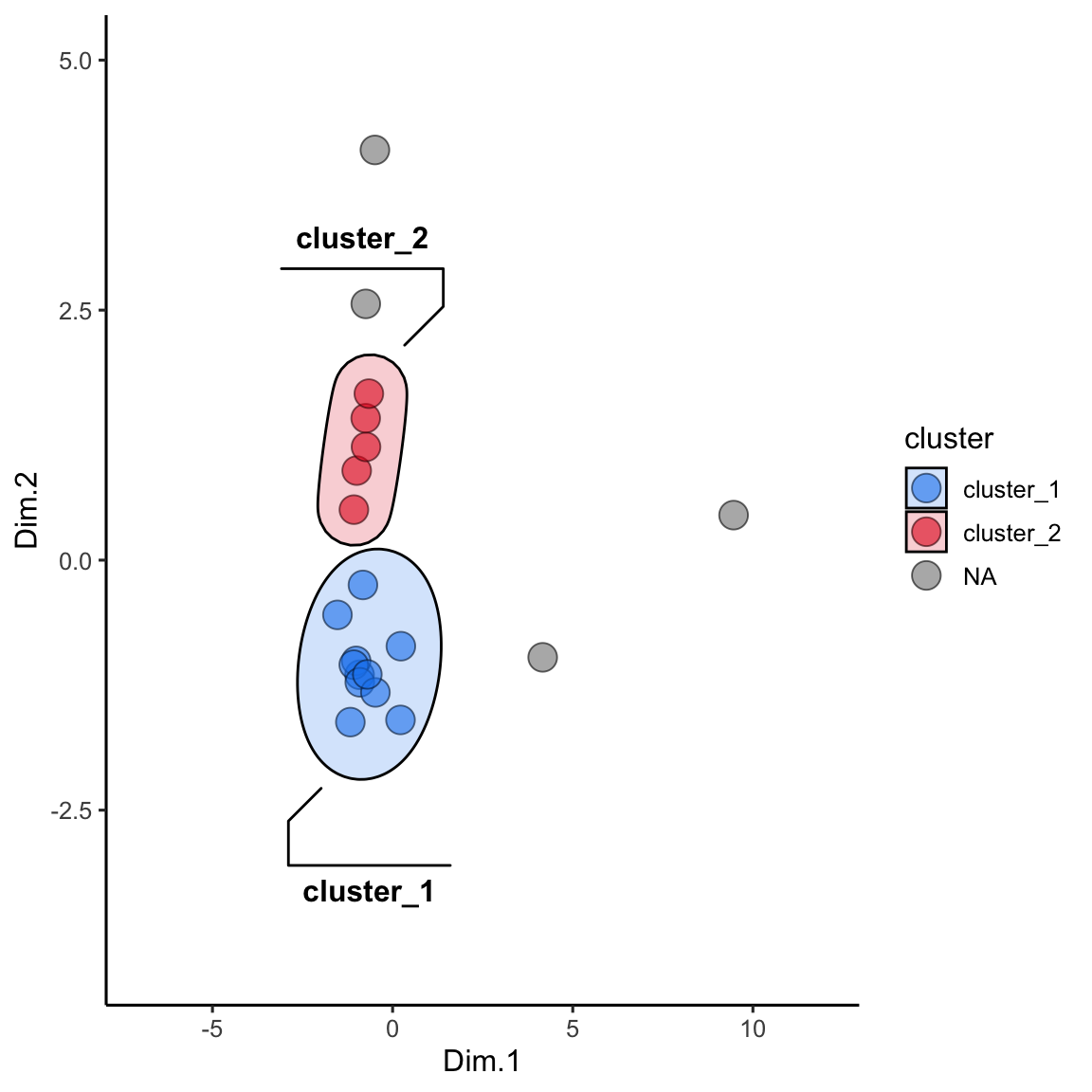 aes(x = Dim.1, y = Dim.2, label = cluster, fill = cluster), alpha = 0.2