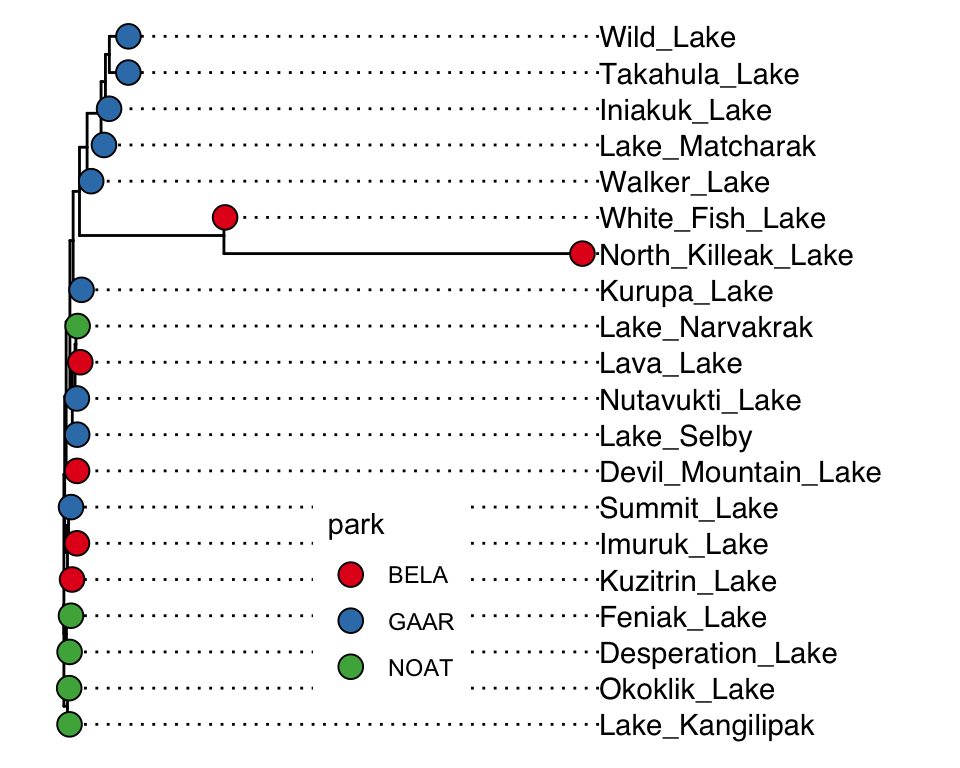 geom_tippoint(shape = 21, aes(fill = park), size = 4) +