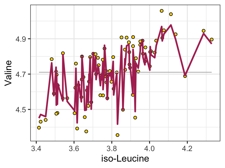 aes(x = iso_Leucine_values, y = predicted_Valine_values), color = "red"